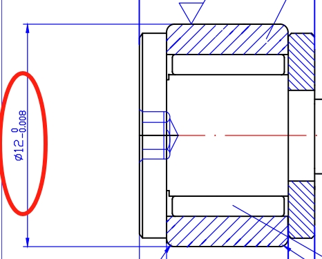 例如,图中外圈的直径标注为φ12 0^-0.008,表示实际直径允许在11.992mm至12mm之间波动。