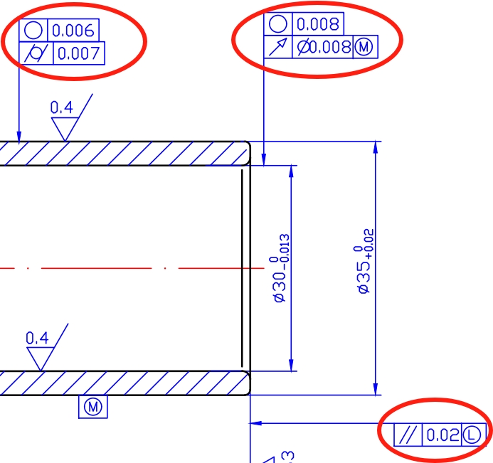 圆度:O0.008,表示该横截面上实际轮廓与理想圆的偏离程度为半径差为0.008mm的两同心圆。即确保零件截面形状接近理想圆。